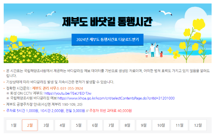 제부도는 바닷길이 열릴 때만 통행이 가능하기 때문에 제부도물때표를 모르고 가실 경우 섬으로 들어가지 못하고 물이 빠질 때까지 몇 시간씩 기다려야 할 수 도 있습니다.  제부도 방문계획이라면 아래 제부도 물때시간표 반드시 확인하고 시간맞춰 방문하시어 소중한 여행계획이 어긋나는 일이 없도록 하시길 바랍니다.